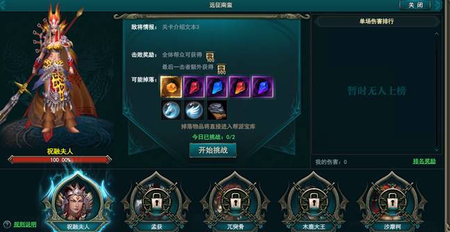 远征南蛮一共五关,全帮共享关卡进度,关卡每周一00:00重置,每个玩具每天最多挑战两次,每日的00:00重置挑战次数。每个关卡通关后通过邮件发放最后一击奖励,单场上号排名奖励,帮派奖励,南蛮守将掉落的物品将直接进入到帮派宝库供家族管理分配。关卡内无法复活,死亡,掉线,离线,退出将提前结束挑战。