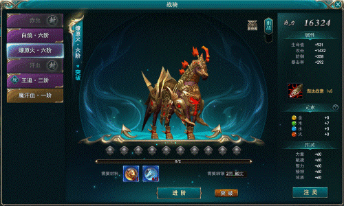 6阶且突破的燎原火可提供16302点战力,1432点攻击,升阶和注灵需要的材料数量与白鸽一致