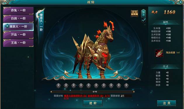 战骑获得后,玩家需要消耗一定的材料来让战骑进行成长,同样可以为人物带来大量属性加成,从而提 升战斗力。材料主要来源于日常活动当中。